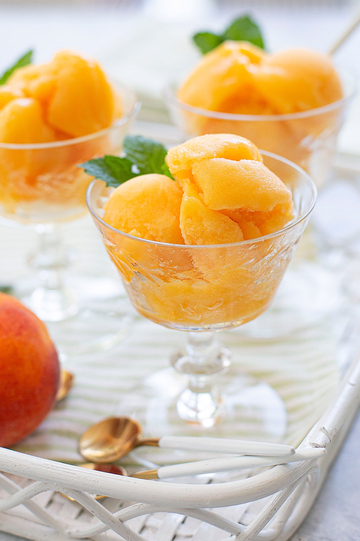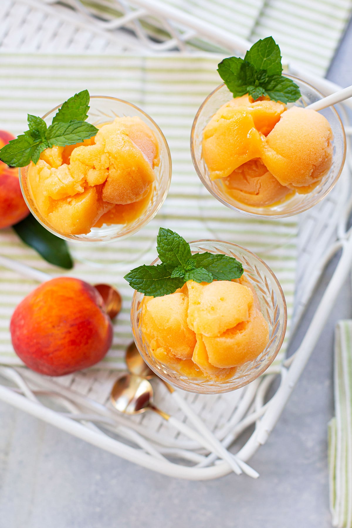 - When ready to serve, let peach sorbet sit out a few minutes to soften slightly. Serve and enjoy!