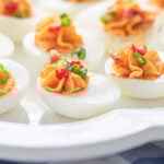 Adjust seasonings to personal taste. Add more hot sauce or jalapeños for spicy pimento cheese deviled eggs. More garnish ideas: a sprinkle of sea salt, sriracha, candied bacon, chives, etc.